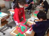 色画用紙に切り込みを入れて、とび出すクリスマスカードを作っています。ハートや星型...