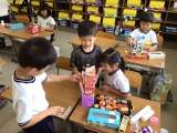 図工の時間、家から持ってきた空箱やラップ芯、卵ケース等を使って 積み上げたり形を...