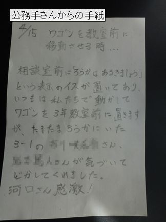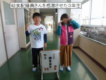 3年廊下にある「ろうかはあるきましょう」という表示が貼られた椅子が、給食ワゴンを通せんぼしていることに気づいた3年生が、椅子をずらして通してくれたそうです。給食配膳員さんは、とてもうれしかったとのことです。