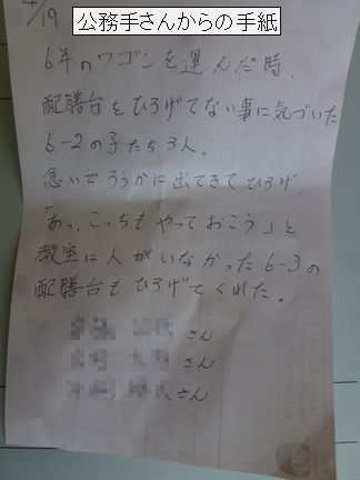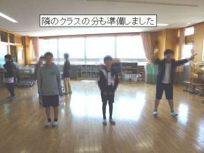 3時間目終了後に配膳台を廊下へ出すのですが、この日は係が忘れていることに気づいた3人が、まず自分のクラスの配膳台を出しました。隣のクラスも出ていないことにも気づき、進んで出してくれました。