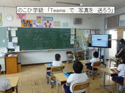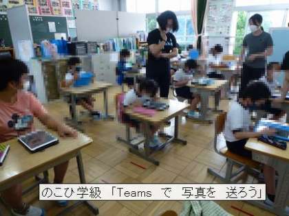 5月25日 のこひ学級 Teamsで 写真を送ろう 公開日 2021/05/25 更新日 2021/05/25 校長室から 今週末の持ち帰り訓練に向けて、全学年、学習用タブレットの扱い方の授業をしています。 今日は、のぞみ・こだま・ひかり学級で、学習用タブレットで写真を撮り、学級のみんなに送って紹介する練習をしていました。 きちんと落ち着いて着席し、先生のお話をよく聞く姿は、学校で一番です。すてきな写真が撮れるといいですね。