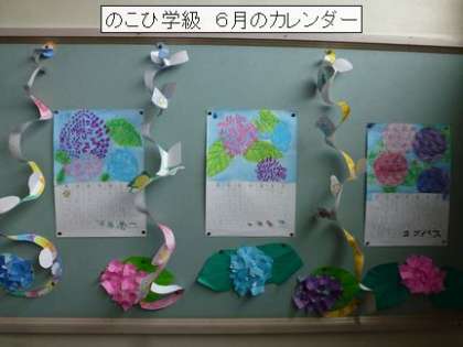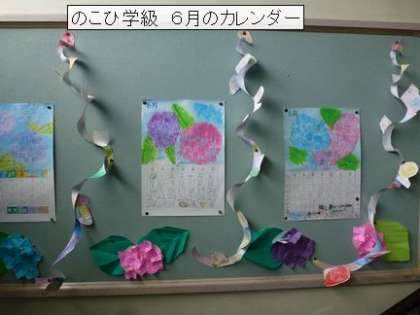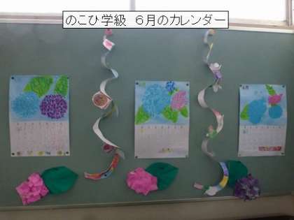 のこひ学級では、季節を感じる学習をしています。全員でアジサイを描いてカレンダーにしたり、色紙でアジサイやカタツムリを折ったりしました。