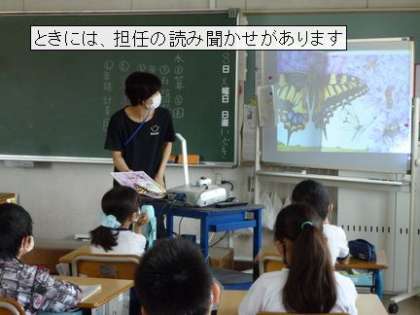 本の世界に浸るだけでなく、語り手とのコミュニケーションを楽しむ姿も見られます。読み聞かせで出会った本を、図書館で探す子どももいます。図書委員会では、毎月多読賞として、各学年でたくさん本を借りている人を紹介しています。