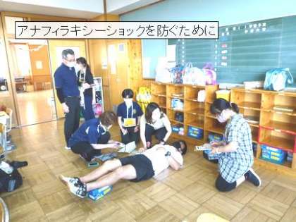 万が一の時に、迅速にチームで動けるように、アナフィラキシーショックに対応するシュミレーション訓練を行いました。救急車が到着するまでに、わたくしたちがやれること・やらなければならないことを訓練しました。今後、毒蛇や蜂にかまれた時の対応も訓練したいと思います。