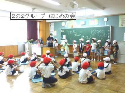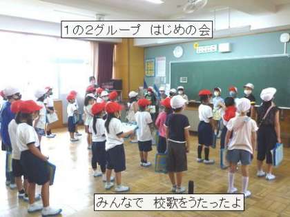 今日は、2年2組と1年2組のなかよしがっこうたんけんです。はじめの会では、校歌を歌ったり、班で自己紹介したりとたんけんへの気持ちを高めました。