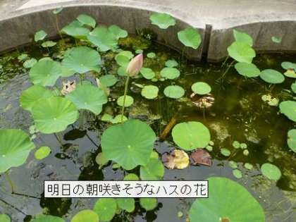 トンボ池のハスのつぼみが開花を待っています。細い茎の上のふっくらとした淡いピンクのつぼみは、キャンドルの灯のようです。朝早くに開花して、お昼には閉じてしまいます。そのサイクルで4日間咲いてくれるようです。明日が、1日目になりそうです。楽しみですね。