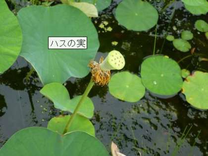 ハスの花が咲いた後に、ハスの実ができました。乾燥ハスの実は、精神を安定させる薬効を持ち、薬膳料理に使われているそうです。根(地下茎)は「あなのあいたレンコンさん」です。