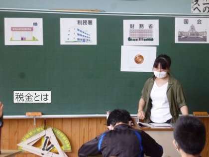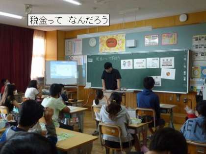 税務署より講師に来ていただき、「税金って何だろう」の学習をしました。税金がないと公共のものがなくなって、今の生活が保てない怖さも知りました。銀のトランクに詰められた偽の一億円札の重さに、驚く6年生でした。