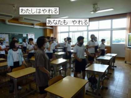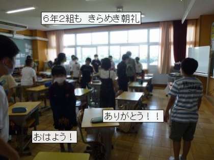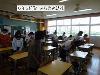 7月13日 今日のきらめき 6年生発きらめき朝礼 公開日 2021/07/13 更新日 2021/07/13 校長室から 3年生も6年生に教えてもらってやっているとは聞いていました。 6年3組の子どもたちが、きらめき賞出張授与式後、 「ぜひ、私たちがやっている『きらめき朝礼』を見てください。」 と呼び止めてくれました。 元気いっぱい、クラス中で体も使って唱えるあいさつ「きらめき朝礼」 なるほど、子どもたちのパワーに元気をもらいました。