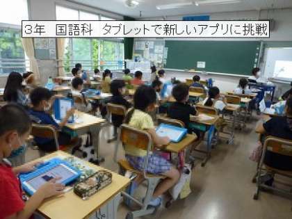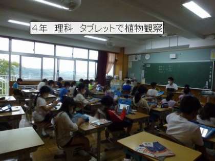 3年生は、学習用タブレットで新しいアプリの使い方を学んでいました。4年生は、雨天で外に観察に行けないので、タブレットで植物の観察をしていました。学習用タブレットは、自席で静かに学ぶことができるので、3密を避けるうえでも、よい学習道具です。
