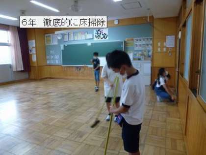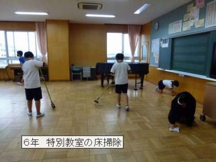 6年生は、一足早く、前期のしめくくり大掃除を行いました。6年生全員が、6年生教室・特別教室・各階トイレに分かれて、だまって・いっしょうけんめい・じかんいっぱい掃除をしました。無駄なおしゃべりを一切せず、進んで汚れを見つけて作業する姿に、野見小学校の最高学年を感じました。