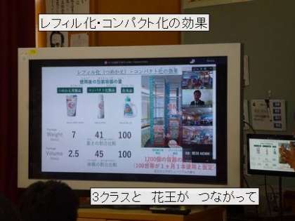 5・6時間目に、6年生3クラスと花王の担当部署がつながって、オンライン環境学習をしました。花王さんの企業努力を学んだあと、自分たちの取り組についても話し、意見を交換しました。
