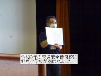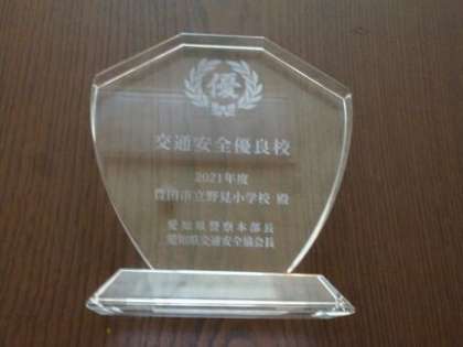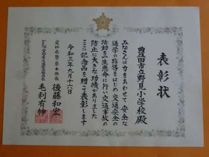 野見小学校が 令和3年度の交通安全優良校に選ばれました 公開日 2021/10/11 更新日 2021/10/11 お知らせ 野見小学校は、このたび「愛知県警察本部長・愛知県交通安全協会長表彰」を受け、令和3年度の交通安全優良校に選ばれました。県下で43校、豊田警察署の推薦です。 通学団ごとの安全な登下校、手あげ横断、止まってくれてありがとう運動が評価されました。 これからも、登下校や自転車の運転に気を付けて、交通事故0を続けていきましょう。