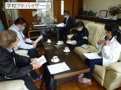 引き続き、校長室で、学校アドバイザー会を行いました。学校アドバイザーは、学校経営方針や教育活動の実効性を高めるために、さまざまな視点からご意見をいただく制度です。