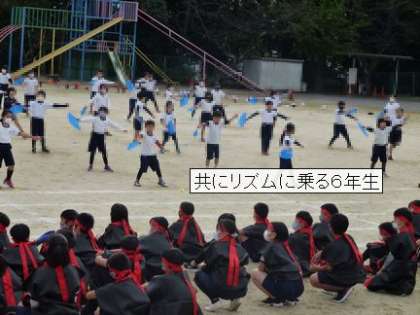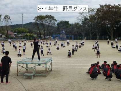 10月27日 運動会 ダンス交流会 3・4年生 公開日 2021/10/27 更新日 2021/10/27 校長室から 3・4年生が、5・6年生に「野見ダンス」を披露しました。 前半は、3年の法眼学習で学ぶ「巫女舞」や「すもう」をアレンジした創作ダンスです。 後半は、扇を使って楽しく踊ります。