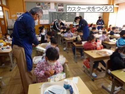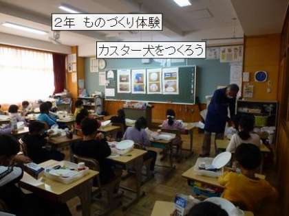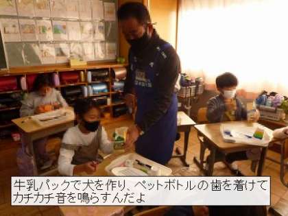 今日は、前回と別のクラスが、ものづくり体験をしました。「コップかえる」と「カスタ犬」です。