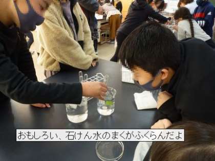 ふりかえりもしっかりとできるクラスです。今日の学びを生かして、次にやりたいことを考えました。水や金属、プラスチィックでも同じことがいえるか調べたい。水の温度を変えてまくの変化を見てみたい。など、身近な科学を進んで楽しもうとする姿を頼もしく感じました。