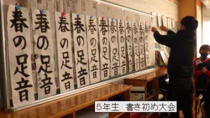 5年生です。「春の足音」 自分の書いた字を眺めて、次に生かす姿がありました。
