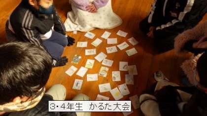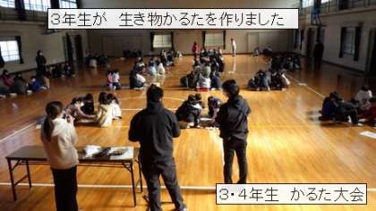 3年生が作ってきた「生き物かるた」のお披露目として、4年生を招待して、3・4年生合同でカルタ大会をしました。