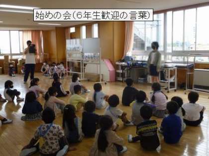 新型コロナ感染症対策として、昨年度から6年生と1年生が体育館とワークスペースに分かれて、交流する形をとっています。