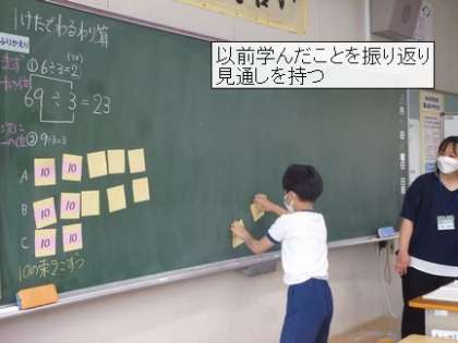 5月11日 4年1組算数科少人数指導 授業研究 公開日 2022/05/11 更新日 2022/05/11 校長室から 4年1組で算数科少人数指導 授業研究が行われました。 3年生で学習した69÷3の解き方を振り返り、72÷3の解き方の見通しを持ちました。具体物を操作する数学的活動をヒントに学び合うことができました。