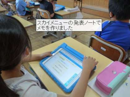 子どもたちは、学習用タブレットで、スカイメニューの発表ノートにメモの付箋を作り、自由に並びかえながら考えていました。