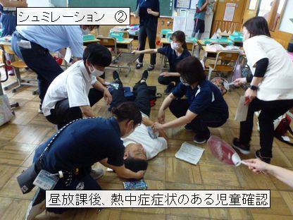 緊急時に、全教職員が協力して、速やかに救命措置がとれるように緊急体制のシュミレーションを行いました。熱中症も心配される時節ですので、