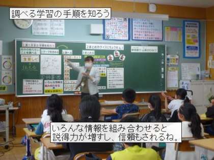 5年生は、図書館管理課から講師をお招きし、調べる学習の手順について学びました。