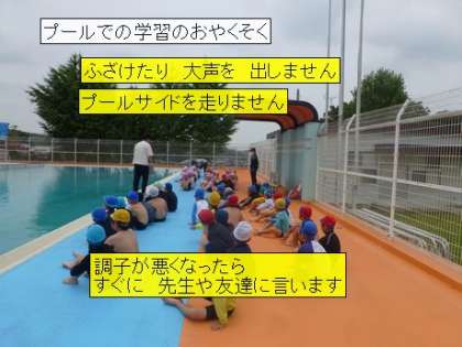 今年は2時間続きで、たっぷり時間をとっておいたのですが、2年ぶりの初日だからでしょうか。ぴったりした水着がなかなか着られない子。水泳帽の中に髪の毛を入れられない子。ゴーグルをつけると帽子が脱げ、何度もやり直して涙ぐむ子。自分の着ていた服を散らかしてしまう子。・・・プールでの学習に入る前にいろいろなトラブルがありました。プールサイドに集合した時には、もう3時間目が終わろうとしていました。