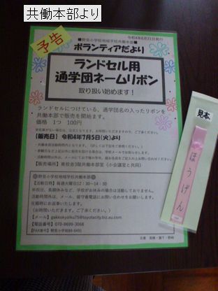 野見小学校地域学校共働本部では、7月5日よりランドセル用通学団ネームリボンの販売をします。1個100円です。