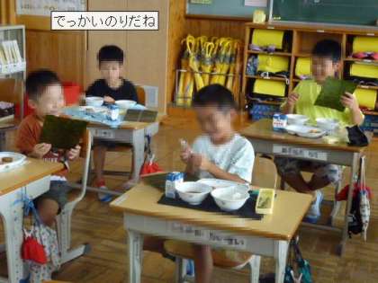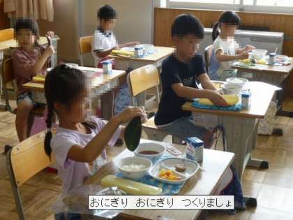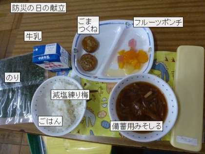 豊田市の給食でも、毎年「防災献立」が提供されます。備蓄用の味噌汁・フルーツポンチに、ごはん・海苔・うめびしおで、自分で梅おにぎりを作って食べます。海苔は大きなビニルに入っていて、食品に手を触れなくてもおにぎり(おにぎらずの要領で)ができるようになっています。