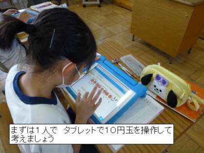 コロナ以前は、10円玉の模型を机の上で実際に動かして考えていましたが、学習用タブレットのおかげで自由に動く10円玉のページが配信され、子どもたちは思い思いにタグレットの画面で10円玉を30円ずつのまとまりにして考えていました。