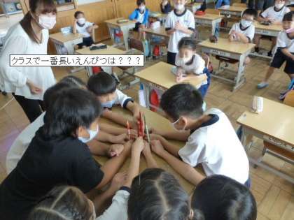くらべっこでは、直接比較(くらべたいものを並べて)⇒間接比較(別の道具を利用する)⇒任意単位(ブロック何個分、コップ何はい分)という体験から、2年生で、普遍単位(センチメートル・リットル)を学習します。