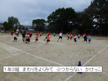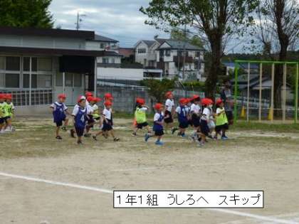 はじめに、準備運動です。足を使った運動をたくさんやりました。 かけっこ・おにごっこ・スキップ・後ろスキップ・カニさんで走る・足ジャンケン・・・