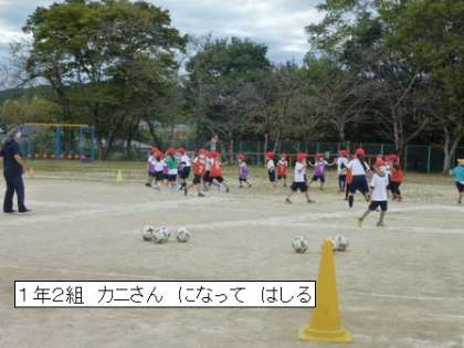 1年生は、2時間目に グランパス サッカー教室を行いました。3人のコーチが来てくださいました。