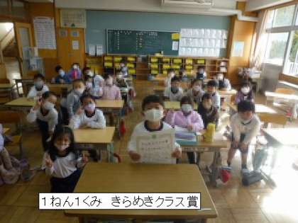 1ねん1くみの皆さんは、全員にきらめき賞を授与されましたので、きらめきクラスとなりました。笑顔がかわいい1年生です。