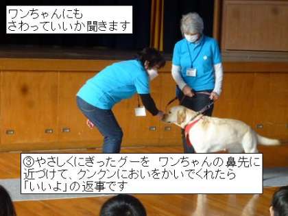 (3)ワンちゃんにも触っていいかたずねる。やり方は、親指を中に入れたやさしいグーを、ワンちゃんの鼻先にそっと近づける。クンクンにおいをかいで、しっぽを振ってくれたら「いいよ」の返事。後ろへ下がって逃げるようなしぐさは、「いやだよ」の合図。