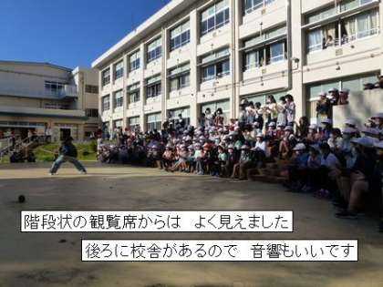 3年後の創立150周年記念に向けた法眼学習「野見のステキ」さがしで、法眼広場に興味を持つ人がいました。ある5年生は、2010年航空写真を見て、そのころの法眼広場には、ステージに向かって、長椅子があったことを発見しました。そこで、法眼広場で、お笑いやダンスや音楽のコンサートしてみてはどうかという意見が高学年から出されました。