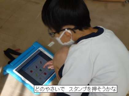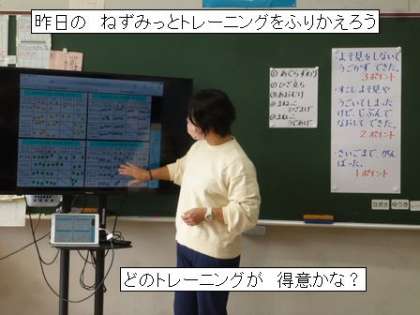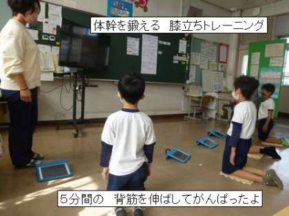 11月22日 ひかり学級 研究授業 公開日 2022/11/22 更新日 2022/11/22 校長室から ひかり学級が、自立活動の研究授業をしました。 体幹を鍛えるトレーニングです あぐら座位を5分間、膝立ちを5分間、あおむけリラックス、まねっこ膝曲げ、まねっこ腕上げを行いました。 学習用タブレットの発表ノートで、自己評価の記録をスタンプで残します。最高の3ポイントがたくさん出ました。 ひかり学級の姿勢がよいのは、このトレーニングのおかげなのですね。