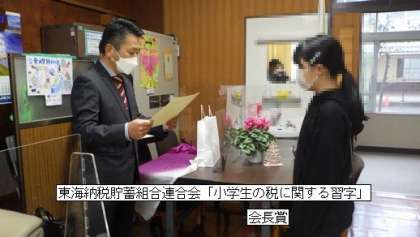 豊田税務署管納税貯蓄組合連合会の会長がお越しくださり、「小学生の税に関する習字」で会長賞に輝いた6年生の表彰を行っていただきました。