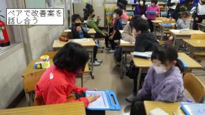 学習用タブレットでのプログラムを受取ると、子どもたちは、スクリプト「前に進む」「回転」「分岐」「繰り返し」などを器用に組み合わせ、桃太郎が鬼退治できるようにしました。ペアで、改善案を話し合うなど、ゲームのプログラマーになっていました。