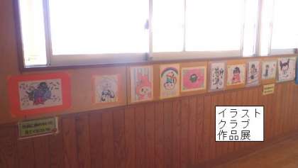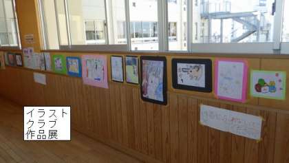 イラストクラブの作品展を 新校舎の2階の渡り廊下で開いています。