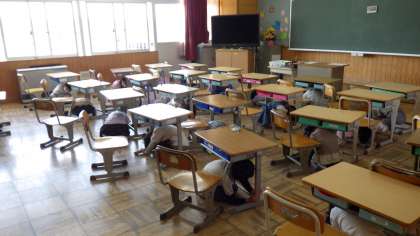 10時のサイレンで机の下に身を隠し、頭を守りました。その後、運動場へ避難しました。