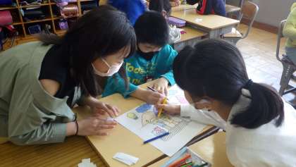 5年生の教室では、班で協力し合って絵に色を付けるゲームに挑戦していました。