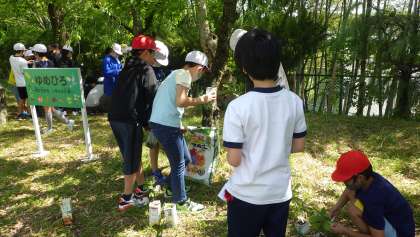6年生は、育てているドングリの苗の世話をしました。