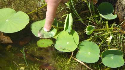 ハスの葉が水をはじく性質を発見し、「だから水に浮くのか」とハスの葉の不思議に納得していました。