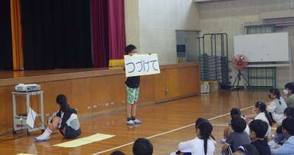 あいさつ運動を呼び掛ける寸劇を交えた楽しい発表に、体育館中に笑顔が広がりました。