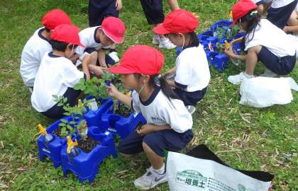2年生が、家から持ってきた野菜の苗を鉢に植えていました。
