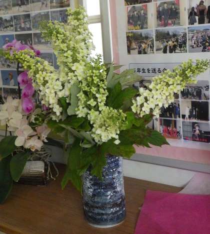 3年生の子が家からカシワバアジサイを学校へ持ってきてくれたので、教頭先生が受け取り、職員室前の廊下に飾りました。柏餅でおなじみの柏に似た葉の形です。アジサイが好きで、我が家にも様々な種類のアジサイがありますが、どのアジサイも少しずつ色づいてきているので、バラの5月も終わりが近いということでしょうか。