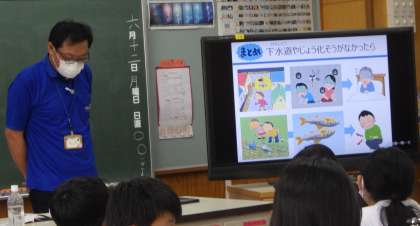 4年生が豊田市上下水道局の方に来ていただき、下水道の学習を行いました。下水道が道路の下にあって、川や街をきれいにしてくれていることを学びました。食べ残しや油が下水道に流れると、下水道が詰まってしまうことも知りました。
